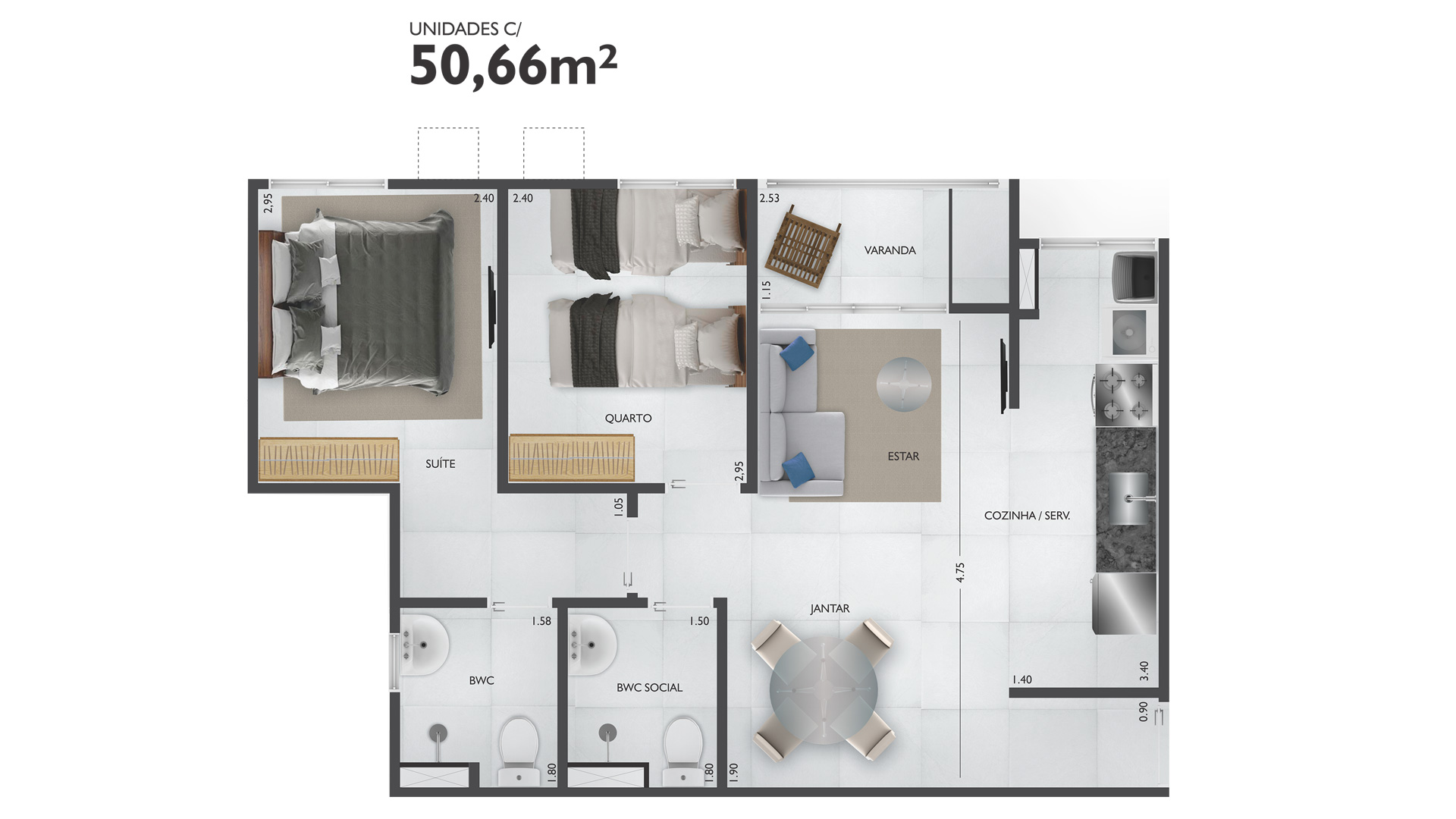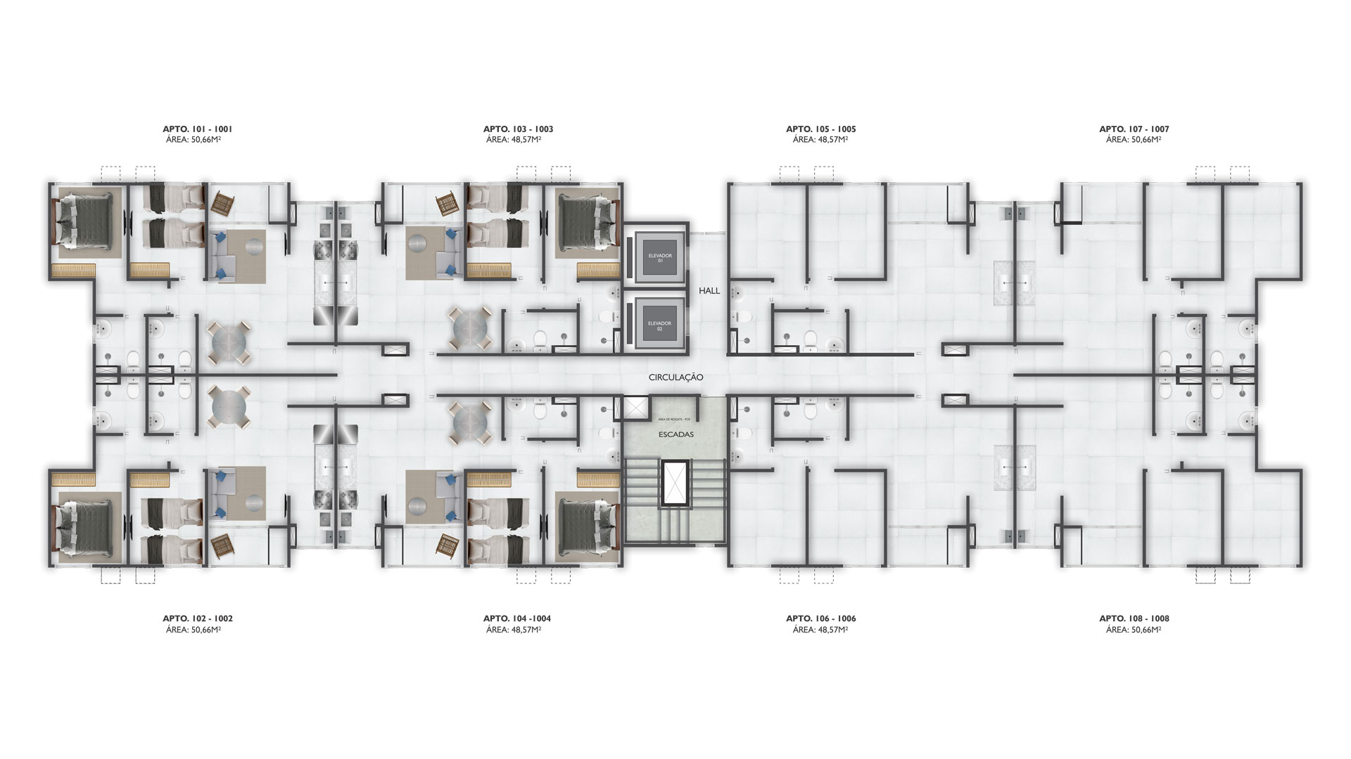 • 96 aptos 2 quartos (1 suíte) com 50,67m²